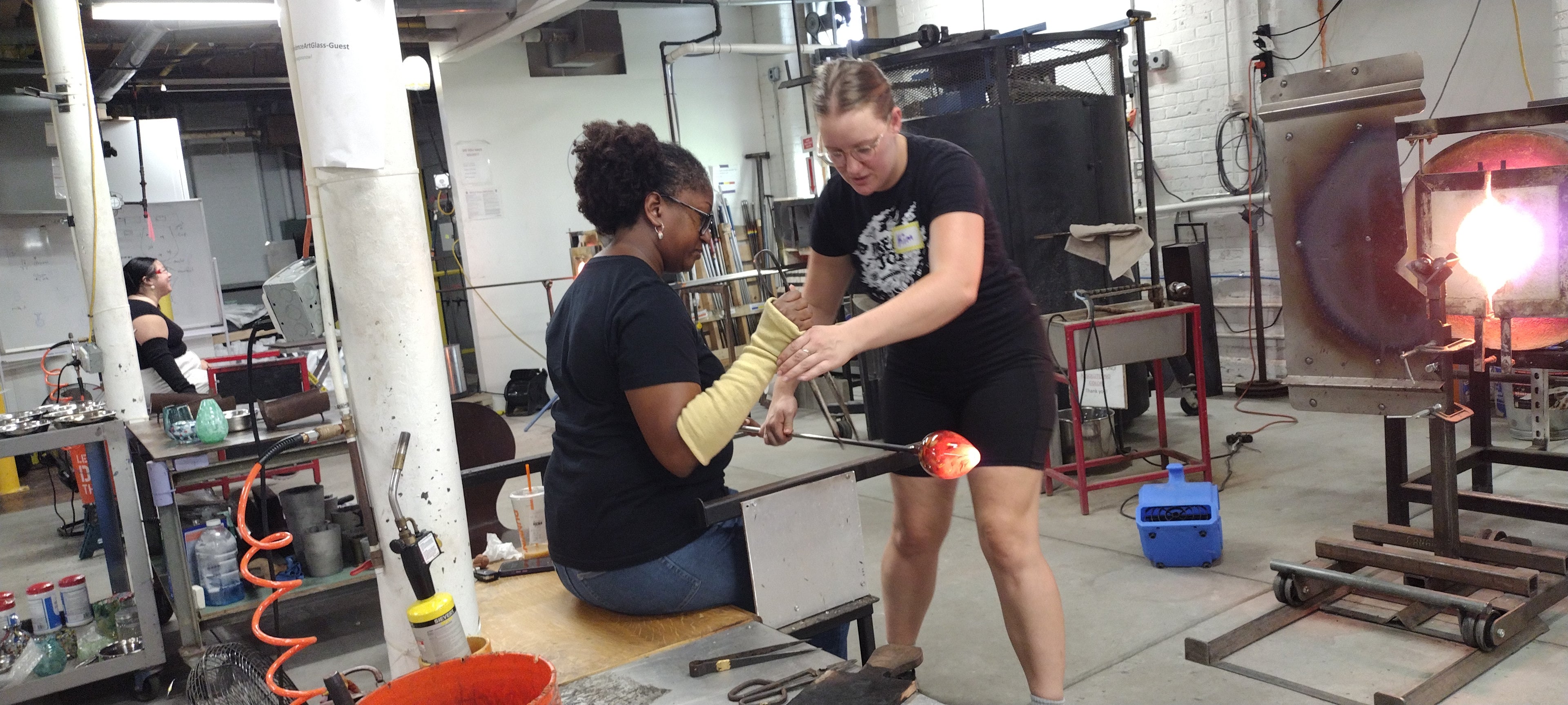 At BRGC, Rebecca wears many hats. She designs curriculums, manages a team of 13 glass educators and two full-time staff members, and oversees the gallery and gift shop. “We operate as a team. It takes a village to run a community glass center,” she says, emphasizing the familial atmosphere that defines BRGC.