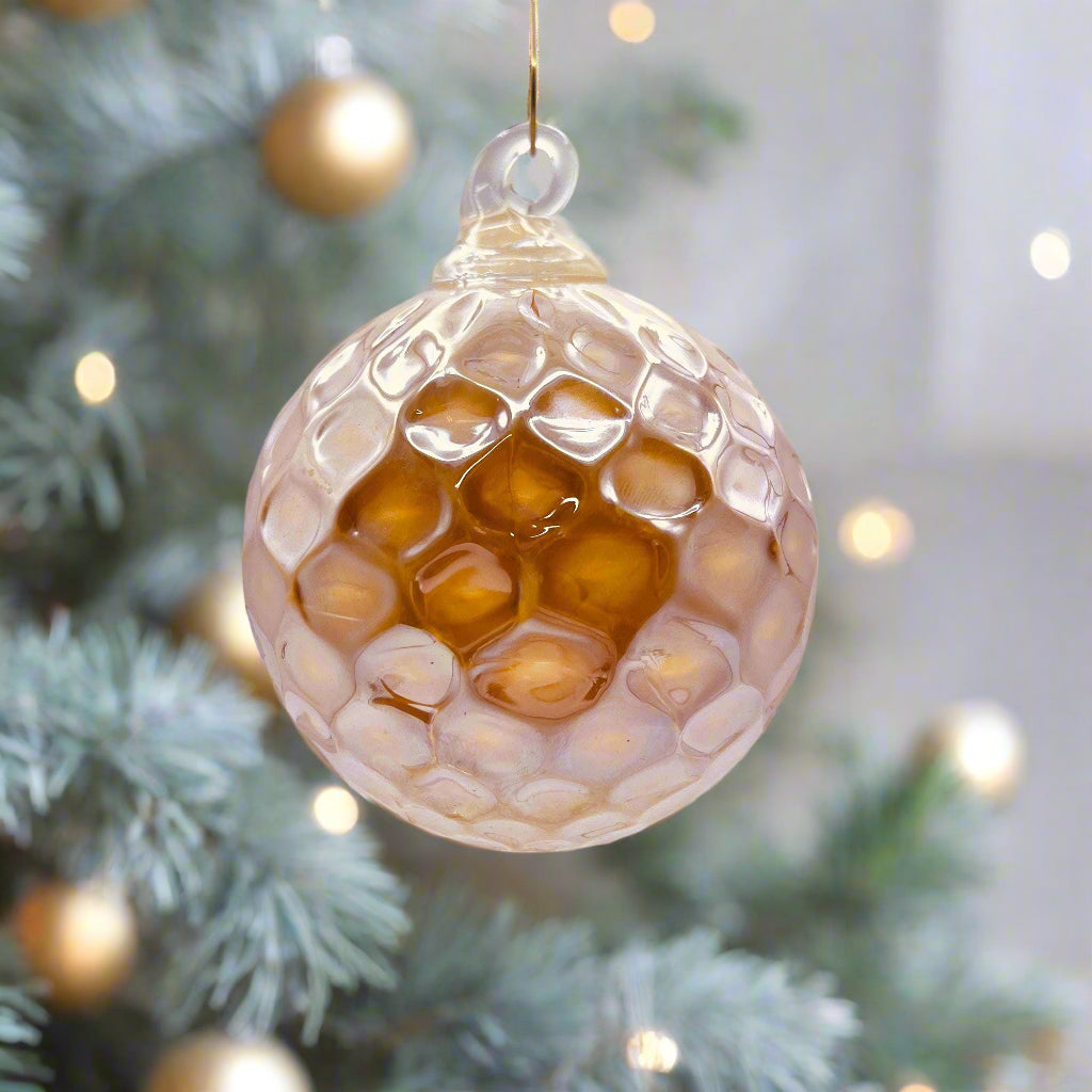 You are viewing a beautiful Vanilla Gold Diamond hand blown glass ornament. This Vanilla Gold Diamond piece measures 4x4 inches and shines elegantly in any space. Also known as Friendship Balls, Xmas Balls, or Witches Balls, this Vanilla Gold Diamond ornament looks great in a window year round. It makes a thoughtful friendship gift and is perfect for holiday gift giving. Each Vanilla Gold Diamond ornament comes ready for gifting in a lovely Kraft gift box and includes a bio card. This Vanilla Gold Diamond ornament is 100% hand blown and created by Rebecca Zhukov, owner of Blackstone River Glass Center.